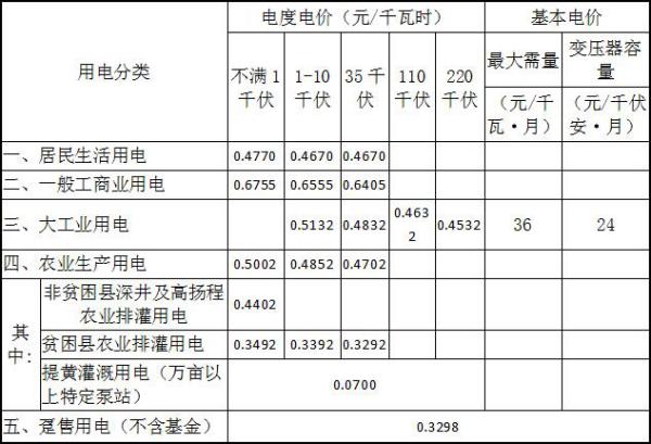 注:1、上表所列價(jià)格,除貧困縣農(nóng)業(yè)排灌用電、躉售用電外,均含國家重大水利工程建設(shè)基金0.7分錢。