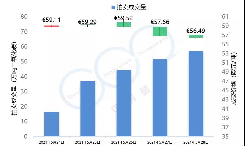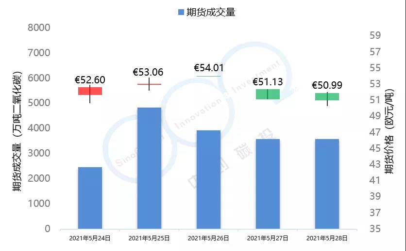 2021年5月24日至5月28日,由于全球能源市場表現(xiàn)較為疲軟,市場投資者對于配額需求的預(yù)期不景氣,歐盟碳市場在本周總體呈現(xiàn)下跌趨勢,在本周三漲至53.59歐元/噸的頂峰后,隨即下跌近5個點,最終收于50.95歐元/噸,回落至接近本月初水平。英國碳市場自上周三開市后,在本周迎來交易的第一個整周,在短期試探了59.52歐元/噸的碳價后,英國碳價逐步回落至56.49歐元/噸,該趨勢與歐盟碳市場基本保持一致。本周歐盟碳市場期貨成交量達到1.84億噸,配額拍賣量為平均每天300萬噸左右。英國碳市場本周拍賣成交量達到207萬噸。據(jù)悉,英國政府正在考慮增加2021年英國碳市場配額的拍賣供應(yīng)。
